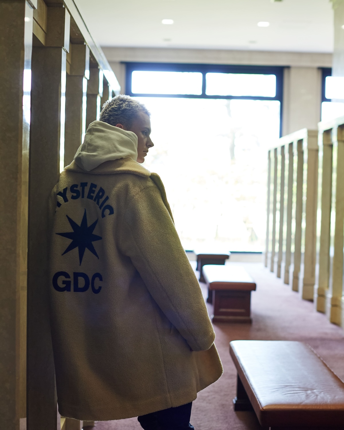 本コレクションでは、GDCの象徴である8芒星STARモチーフのベレー帽を被った女性像を中心に、今回のために制作されたグラフィックをキーモチーフとして制作。"ロンドンの空気を纏いながらアメカジを着こなす、どこかグラムロックの匂いをまとった人物像"をイメージソースに、プロダクトデザインはHYSTERIC GLAMOURが手がけた。