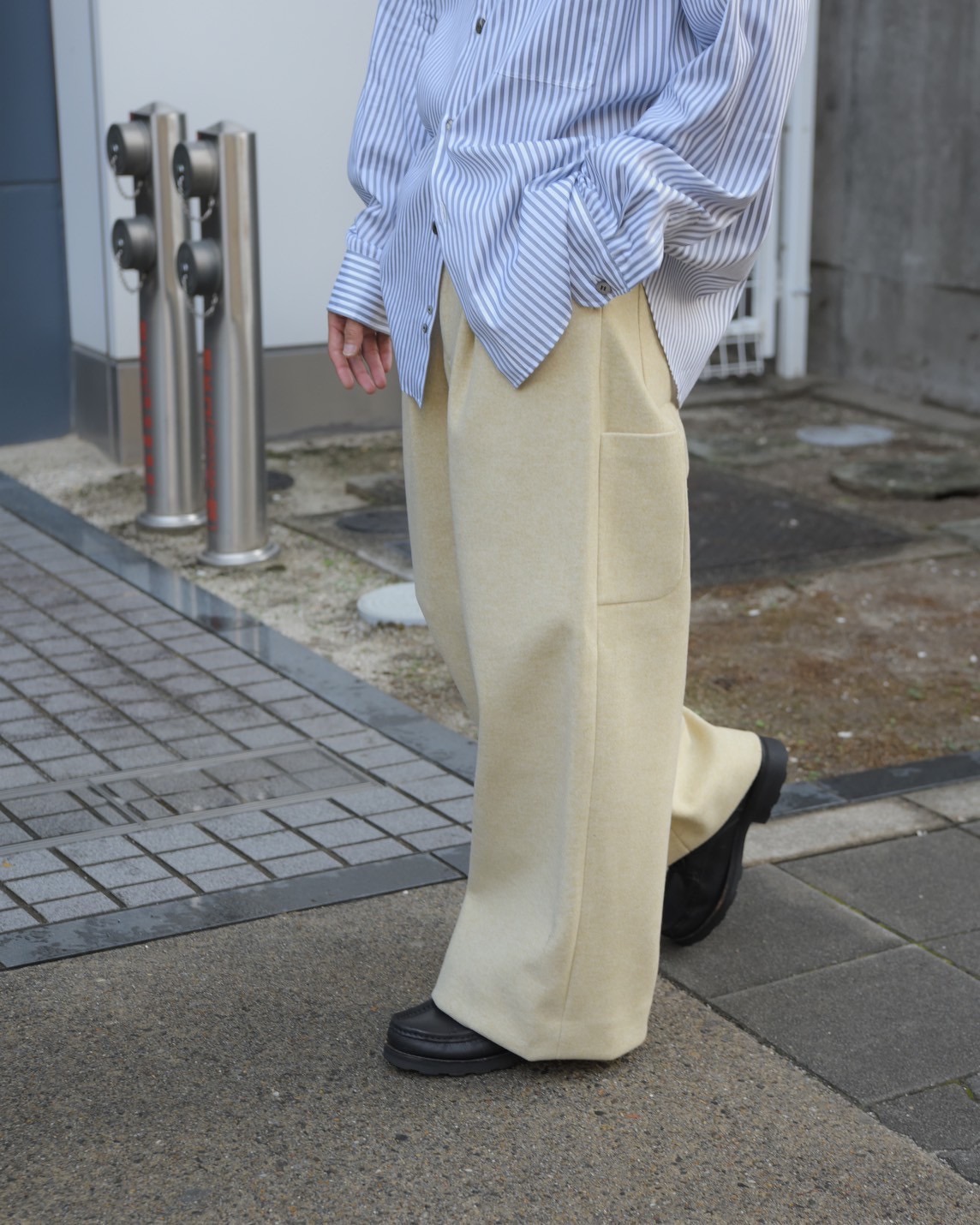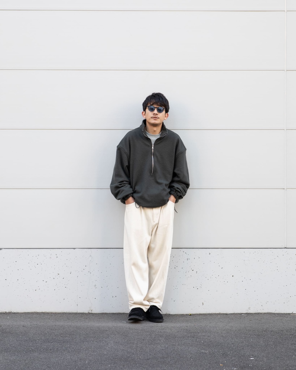 ペインタースラックスをベースにした、カーペットのような膨らみのある素材が特徴的で、表情豊かなこの雰囲気がポイントの一つ。普段はスウェットパンツが苦手という方でも、この洗練された雰囲気なら穿きたいとお店でも好評です。