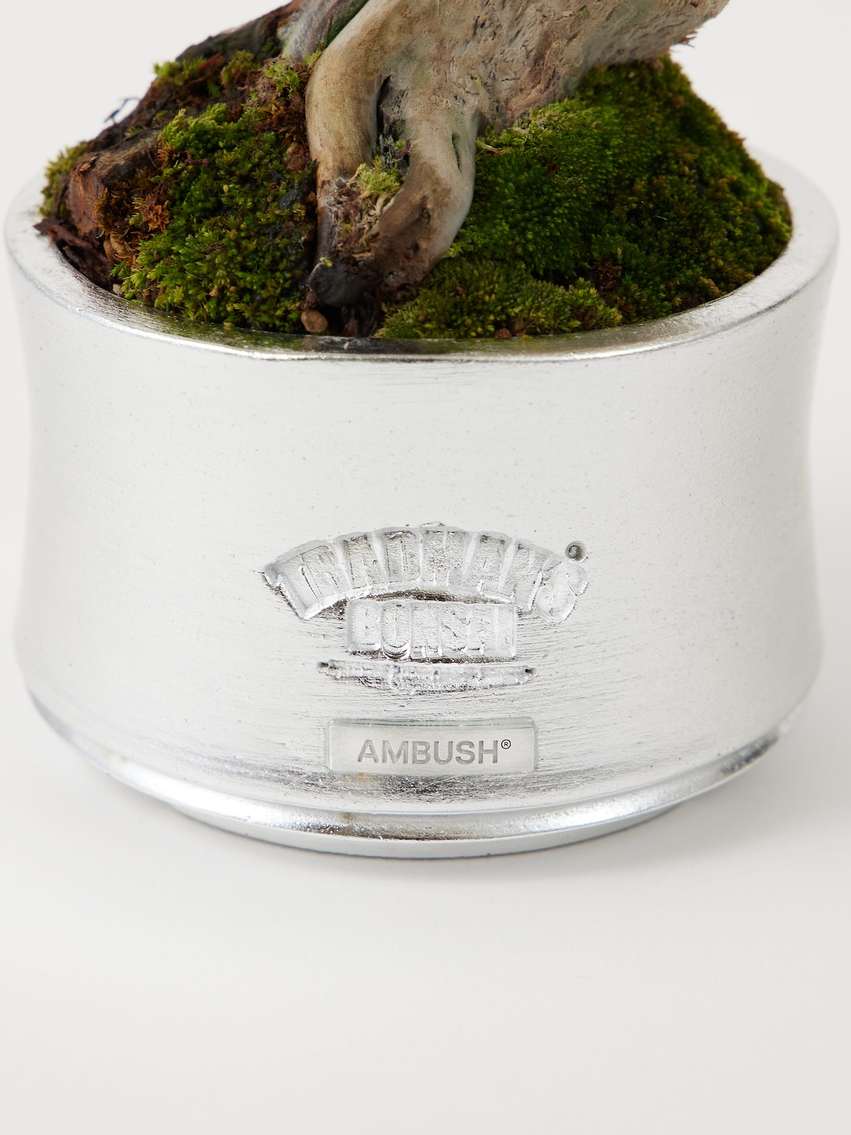 本コラボレーションのために制作された盆栽鉢は、AMBUSH®の原点とも言えるジュエリーからデザインの着想を得た。鉢全体にはシルバーコーティングを施し、フロントにはAMBUSH®とTRADMAN’S BONSAIの両ブランドのロゴが刻印されている。