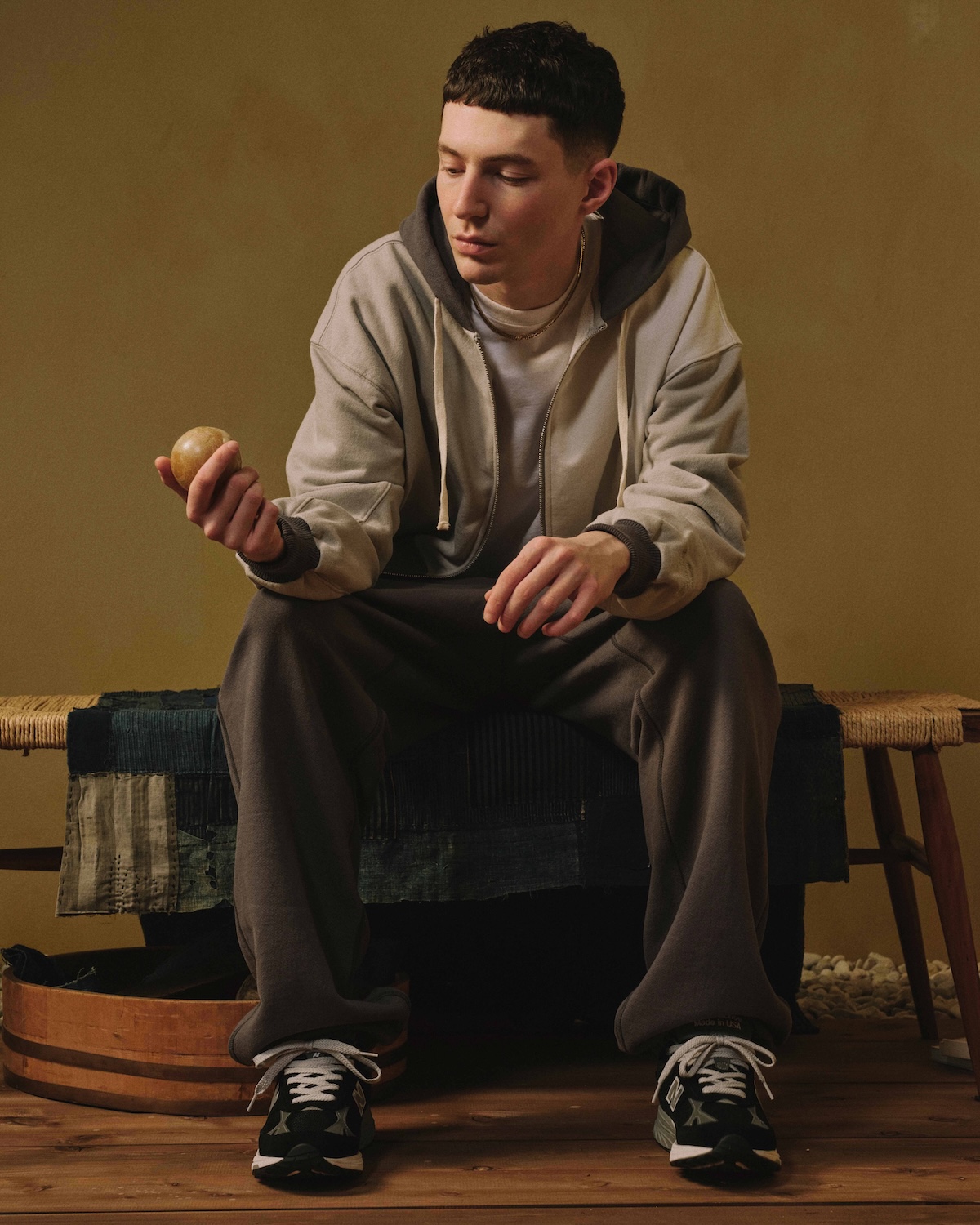 素材には、New Balanceのスニーカーが持つ質実剛健なイメージに呼応する、アメリカ製ならではのタフさと風合いを備えたヘビーウェイトな生地や肉厚なコットン素材を採用。クルーネックスウェットやジップアップフーディー、スウェットパンツ、ショートスリーブTシャツの全4型を展開する。シルエットはインラインモデルよりもゆとりを持たせ、現代的なファッションとして楽しめるバランスへと昇華されている。