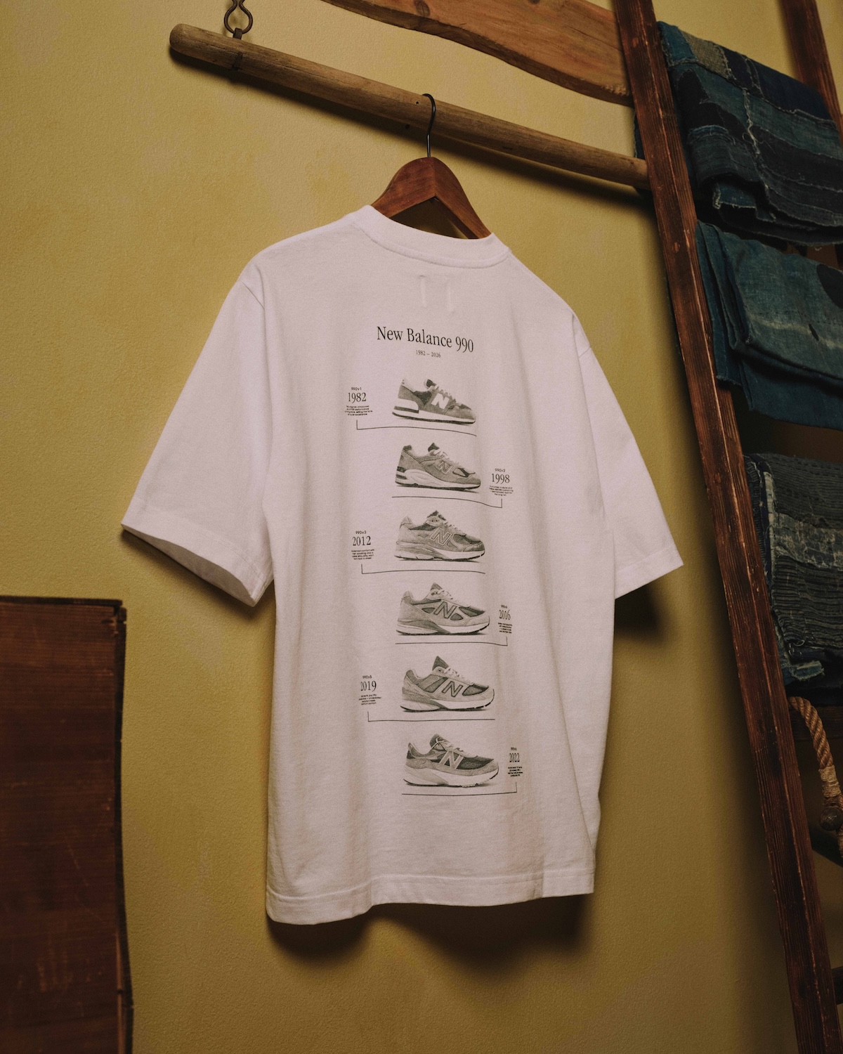 米国製440グラムのコットンフレンチテリーを使用したクルーネックスウェットとフルジップフーディー、スウェットパンツは、ガーメントウォッシュ加工による自然な表情と、BEAMSらしいフィッティングが特徴だ。一方、195グラムのコットンジャージを用いたショートスリーブTシャツには、歴代「990」モデルのグラフィックを落とし込み、コレクションの背景を視覚的にも表現。
