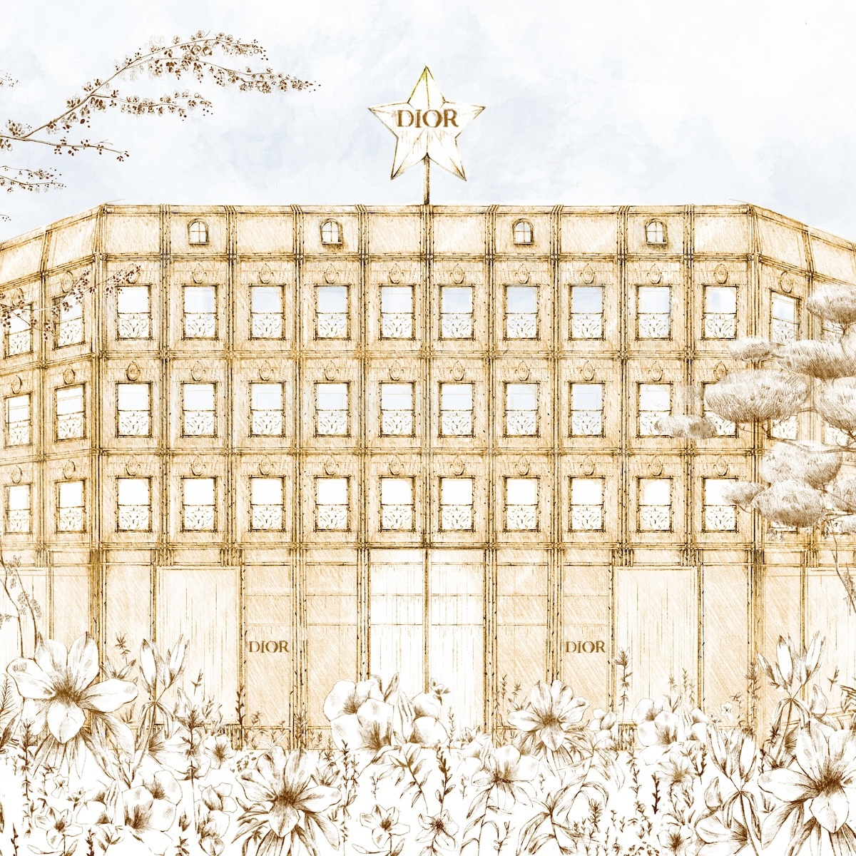 1947年よりメゾンの運命を導いてきた“幸運の星”に見守られるかのように設えられた建築は、パリ本店「30 モンテーニュ」のファサードを、日本の竹林に着想を得たゴールドのバンブーで再解釈。夜には幻想的にライトアップされ、代官山の街に静かな輝きを放つ。